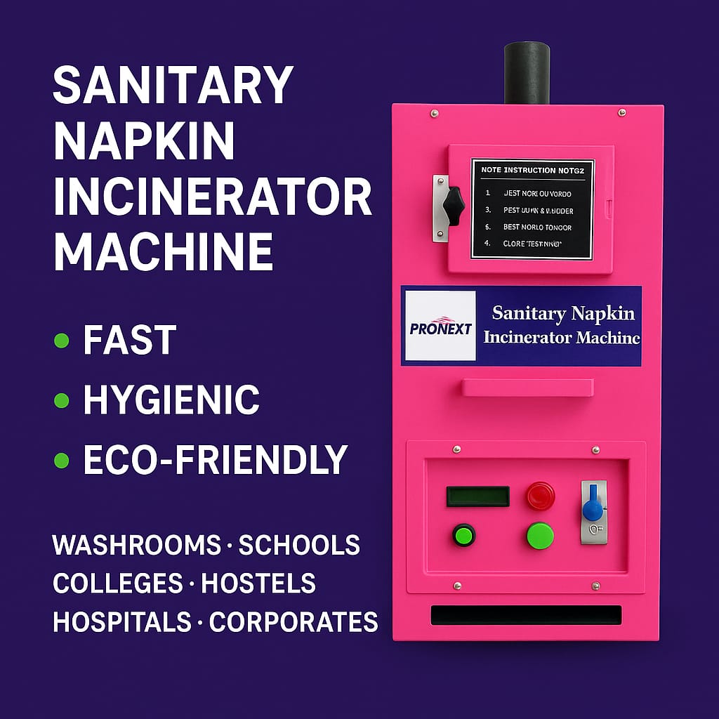 PRONEXT Sanitary Napkin Disposal Machine is a safe and eco-friendly solution for disposing of used sanitary napkins hygienically. This machine helps maintain cleanliness and prevents environmental pollution. The incinerator uses advanced heating technology to destroy sanitary waste efficiently. It is easy to install, energy-efficient, and safe to operate. The machine is ideal for schools, colleges, hospitals, offices, and public washrooms. PRONEXT disposal machines support hygiene initiatives and government sanitation programs. Applications: Schools, Colleges, Hospitals, Offices, Public Toilets, Government Projects Keywords: Sanitary Napkin Incinerator Manufacturer, Napkin Disposal Machine Supplier, Sanitary Pad Disposal Machine India